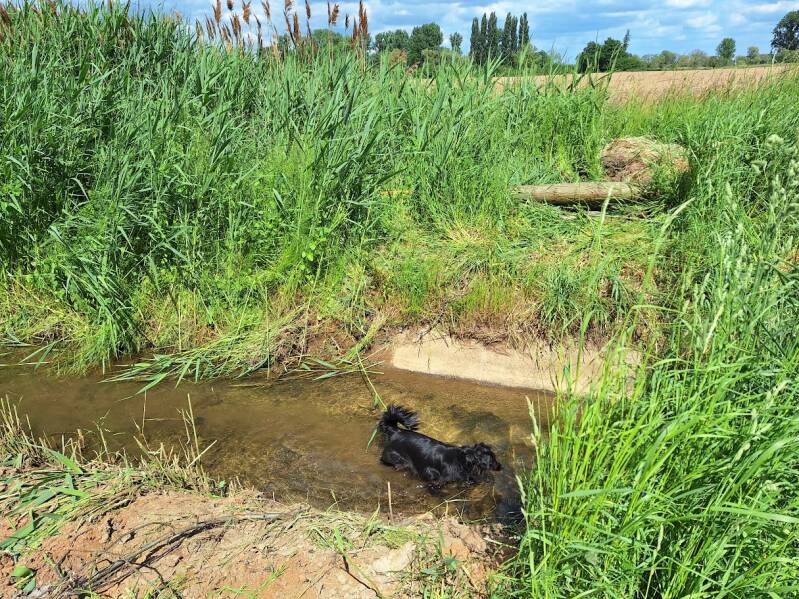 Het wandelen in de directe omgeving bestaat vooral uit grasvelden en langs akkers. Achter het huis is ook een soort vijver met heel hoog gras waar Layla voor mij het pad doorheen waant en als ik niet snel genoeg bij haar komt kijken waar ik blijf.