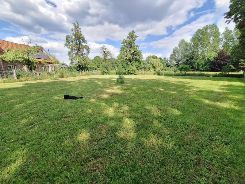 Er is een omheinde tuin voor het huis en daaraan ligt weer een groter stuk grasveld , ook omheind om bv een bal te werpen. Ook buiten de tuin heb ik eigenlijk geen lijn nodig , dus vrijheid alom.