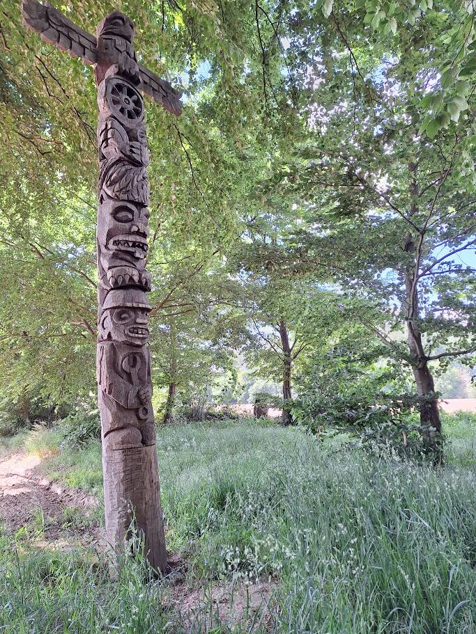 bij het huis is een klein stukje bos waar een totempaal aan de rand staat en in dat plukje bos 4x graf van honden van de eigenaren en een grafsteen van de ouders van de eigenaar, bij navraag alleen de steen. Bij het wandelen is het goed opletten met de vele grasaren en als ik die wil ontwijken kom ik andere aren tegen, namelijk een veld met gerst aren.